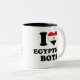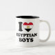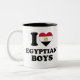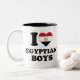 This is a playful novelty mug that features a bold statement, "I Love Egyptian Boys," using the iconic "I ♥" motif. The heart is filled with the Egyptian flag, highlighting a specific affection for Egypt and its male populace. This mug is likely designed as a humourous or affectionate gift, perhaps for someone who has a special connection to Egypt, whether through heritage, travel, or relationships. It's a standard-sized mug with a black interior and a white exterior, which provides a striking contrast for the black and red print.