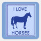 "Bold text at the top reads ""I LOVE"" above a stylised graphic of a horse from the side. The horse is centred within a light blue square with a darker border, and the word "HORSES " is positioned at the bottom.