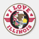 I Love Illinois State Map and Flag. Taking its inspiration from the state flag, this design features a red, white and brown colour scheme, plus red hearts. This frames the central motif from the state flag, displayed on a white state map on black background. With cool distressed typography featuring the phrase 'I LOVE ILLINOIS'.