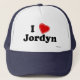 I love Jordyn! Is your name Jordyn? Do you have a husband, boyfriend, male family member or male friend who you know loves you? Or do you have a wife, girlfriend, female family member or female friend named Jordyn whom you love deeply? If so, this "I Love" hat is exactly the gift that you're looking for! The design features the letter "I" in black lettering with a red heart on the top and "Jordyn" in black lettering on the bottom.