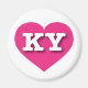 This magnet features a vibrant hot pink heart containing the bold, white, upper case letters KY, the official abbreviation for the state of Kentucky, the bluegrass state.