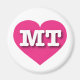 This magnet features a vibrant hot pink heart containing the bold white upper case letters MT, the official abbreviation for Montana, the treasure state.
