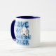 Fun and unique Bedlington Terrier mug! The right side has a Bedlington Terrier drawing, with cool chunky two-toned blue print. It reads, "I Love my Bedlington Terrier." This cute dog lover merchandise has been drawn in an adorable kawaii cartoon style. We also have this design on a tremendous array of other Bedlington Terrier products!