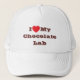 Custom Trucker Style Baseball Hat In White Colour and Chocolate Text Colour and casual fun fashion statement accessory printed with customisable template text phrase I ❤️ My Chocolate Lab Dog on Hats, Shirts and Pet Products by TheFabricSeal print on demand shop at Zazzle.com #ZazzleMade https://www.zazzle.com/store/thefabricseal