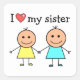 Cute stick figures, one wearing a yellow dress and the other a blue dress, holding hands with big happy smiles. Above the girls in black lettering are the words I Love My Sister. The word love has been replaced by a pretty red love heart with a frilly edge.