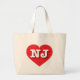 This tote bag features a vibrant red heart containing the bold, white, upper case letters NJ, the official abbreviation for New Jersey, the garden state.