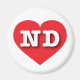 This magnet features a vibrant red heart containing the bold, white, upper case letters ND, the official abbreviation of North Dakota, the peace garden state.