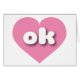 This card features a calm, cool pink heart containing the bold, rounded, white lower case letters ok, a playful version of the abbreviation for Oklahoma, the sooner state. The card is blank inside, awaiting your personalized text or handwritten sentiments.