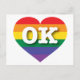 This postcard features a heart with a rainbow pride design and the bold, white, capital letters OK, the official abbreviation of Oklahoma, the sooner state.