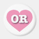 This magnet features a pink heart containing the bold, white, upper case letters OR, the official abbreviation for Oregon, the beaver state.