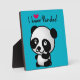 Display your love for pandas to the world. I love pandas text with a hovering heart. A cute and adorable illustration of a black and white panda bear sitting down and looking happy, friendly and loveable. Turquoise blue background.