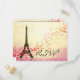 Eiffel tower with sprinkling of hearts fluttering down across a cream and pink background. Easily change text on this design. Matches invitation and postage.