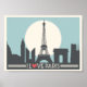 Vintage poster with an illustration of Eiffel tower,gates of victory and other monumental buildings in the moonlight,with the text on the bottom saying "I love Paris" the o in the love is a red heart vector.