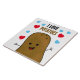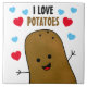 Fun happy brown potato surrounded by red and blue love hearts with I Love Potatoes in black and brown lettering above his head.
