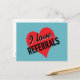 I love referrals design with a red heart on an aqua background is great for realtors or any service business to remind your customers to recommend you. Send to your happy clients after a job or service is complete, or just to your friends and associates as a direct marketing reminder.
