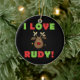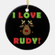 A reindeer with a red nose and text that reads "I Love Rudy!" on a reindeer holiday ornament you're sure to love!