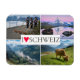 Travel souvenir photo magnet with a collage of four landscape photos of the beautiful country Switzerland, with Matterhorn mountain, alphorn players, a cow in the Bernese Oberland and Lauterbrunnen valley with the text 'I love Schweiz'.