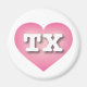This magnet features a pink heart with a white-washed center containing the bold, white, upper case letters TX, the official abbreviation for Texas, the lone star state.