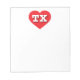 This memo note pad features a vibrant red heart containing the bold, white, upper case letters TX, the official abbreviation for the state of Texas, the lone star state.
