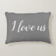 "I love us" in pretty script on a comfy accent pillow. This one's colour is attractive grey with white script, and we have it in many other colours as well. Check out the others with an easy click to see which splash of colour would look best to add this loving message to your home decor. This example is set up with a washable cotton cover, but it's also easy to choose other fabric choices with different prices.