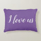 "I love us" in pretty script on a comfy accent pillow. This one's colour is pretty purple with white script, and we have it in many other colours as well. Check out the others with an easy click to see which splash of colour would look best to add this loving message to your home decor. This example is set up with a washable cotton cover, but it's also easy to choose other fabric choices with different prices.