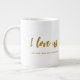 Simple and chic gold and white "I love us" brush script one photo mug with personalised name.