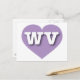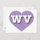 This postcard features a lavender heart containing the bold, white, upper case letters WV, the official abbreviation for West Virginia, the mountain state. The reverse side of the postcard is blank, awaiting your handwritten sentiments or personalised text.