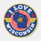 I Love Wisconsin State Map and Flag. Taking its inspiration from the state flag, this design features a navy blue, red and gold colour scheme, plus red hearts. This frames the intricate flag, which depicts the state's coat of arms inside the state map. With cool distressed typography featuring the phrase 'I LOVE WISCONSIN'.