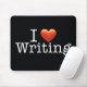 Add bold and unique style to your desk with this "I Love Writing" black mouse pad. The design features bold, white lettering on a black background. The bright red heart symbol adds a splash of colour. Also available in white.