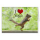 A fun photo of a cute squirrel doing a yoga pose with the text, "I Heart Yoga" above him. The squirrel is on the wooden railing of a deck outside, in a yoga position with his paws in front of him, one leg behind him in the air, and his tail straight out. This squirrel obviously enjoys doing his yoga exercises outdoors, surrounded by nature, with trees in the background. It looks like he's doing his version of the sun salutation and maybe about to go into the downward dog position. You can have this cute squirrel picture printed on many different products that can be easily customised. If you love yoga, and you think squirrels are cute, this is the photo for you!