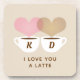 A cute "I love you a latte" personalised drink coaster design for coffee lovers. Includes two coffee mugs with intertwined light pink and latte brown heart shaped steam and a cream coloured background . Personalise the custom text with the couple's first name initials.