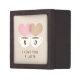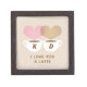 A cute "I love you a latte" personalised wooden storage box for coffee lovers. Includes two coffee mugs with intertwined light pink and latte brown heart shaped steam and a cream coloured background. Personalise the custom text with the couple's first name initials.