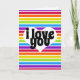 This greeting card features the text 'i love you' in a fun bold font on top of a white heart. (This text can be personalised.) The background is a pattern of bright rainbow stripes. On the back, there is a little red heart in the centre.