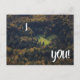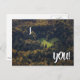 Postcard of a heart shape of grass in a forest in autumn colours on the hills around lake Bled in Slovenia with the text 'I love you!'.