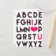 NewParkLane - Cute Postcard, with the alphabet in modern, black typography and the letters for 'I Love You' in hot pink with a big heart.
