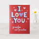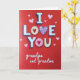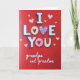 This greeting card centers on the big message “I LOVE YOU” across the middle in large white letters with dark shadowing that makes them stand out. The background is a deep red, sprinkled with many small pink hearts scattered all over. In the word “LOVE,” the first “O” looks creamy and holds a red heart inside it, and the “V” is shaped like a lavender heart filled with tiny white hearts. The second “O” has a soft pink center with a heart detail that matches the sweet theme. Under the main words, “grandpa and grandma” appears in smaller white cursive-style lettering near the bottom. The whole design feels warm and affectionate, like a simple way to say “you matter to me” without needing a long note. It’s especially meaningful for family because it’s direct, loving, and easy to read at a glance 🥰❤️. Hope it helps you share Valentine’s Day sentiments with someone you love.