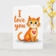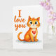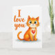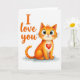 This greeting card shows a cute cartoon ginger cat on a plain white background. The cat has orange fur with a few darker stripes, big blue eyes, and a sweet, curious look. There’s a soft pink blush on its cheeks, which makes it feel extra loving. A bright red heart sits on the cat’s chest, tying the whole theme together 💘❤️. To the left of the cat, the words “I love you” appear in orange letters that look like casual hand lettering. Near the bottom, a few small tufts of light green grass add a simple outdoor touch without distracting from the cat. The overall look is warm and friendly, making it great for romance or a close friendship 😘.