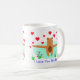 Love is in the air. This brown bear stretches his hand really long to say "I love you this much". Red hearts are floating around him. This is the perfect mug to express your love to your special one this Valentine's Day.