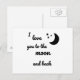This adorable postcard has the words I love you to the moon and back on it in black. With a moon and stars in black.