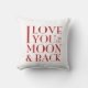 Romantic red-on-white 'Love you to the moon and back' throw pillow. When you click 'Customise it!' you can play with the background colour.