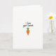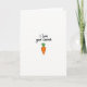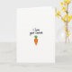 This card shows a simple illustration on a white background, centered on an orange root vegetable character with a tapered shape and a tuft of bright green leaves 🌷. The character has two tiny dot eyes and a small, shy smile that feels like it’s directed at someone special, as if sharing a private joke between friends. Fine, light lines add a bit of natural texture along the orange surface without making the drawing busy. Near the top, the message “I love your carrot” is placed above the character in dark lettering that looks casually written. The spacing leaves plenty of open white area, giving the words and the little figure room to breathe. The orange and green colors stand out clearly against the pale background, keeping the focus on the character’s bashful expression 🐰. The leafy fronds angle upward in a loose cluster, with several rounded tips reaching toward the top edge.