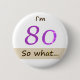 I`m 80 so what Funny Quote 80th BIrthday button. A great button for someone celebrating the 80th birthday. It comes with a funny and inspirational quote I`m 80 so what, and is perfect for a person with a sense of humor. A motivational button for her.