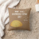 A throw pillow that features a bread joke. The design asks “What does sourdough bread say?” And then the illustrated bread loaf below says “I’m a self-starter!” The pillow has a colour scheme of brown and white.