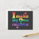 The text "I make my own rainbow" is treated with the colours of the rainbow which makes it very striking and colourful. Two butterflies (one in red and the other in violet) are flying around the words. Rainbow represents positivity and happiness. So the message here is that we are the ones that decide how to make our own happiness, not anyone else. Seize your own happiness! Design by Rusty Doodle.