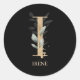 Letter I monogram floral. Letter I in golden brown texture accented with green watercolor compound leaves, flower blossoms and melted gold splashes. Personalised with name in matching font.