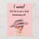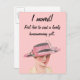 This new home postcard features a vintage image of a well dressed woman in a pink hat, on a pink background. The text reads, "I moved! Feel free to send a lovely housewarming gift". The background colour, and all the text, can be customised as desired.