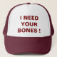 Brown/White trucker hat reads "I NEED YOUR BONES"