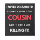 I Never Dreamed I'd Become A Super Cool Cousin But Here I Am Killing It design. This is a short funny quote which is great as an appreciation gift idea for Cousins. Also suitable as Cousin gifts for Christmas or Birthday.