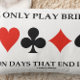 Showcase your wry bridge / duplicate bridge attitude with this throw pillow featuring the four card suits along with the following saying: I Only Play Bridge On Days That End In "Y". Great bridge saying pillow gift for any avid bridge player!