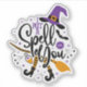 his enchanting Halloween-themed artwork features the playful phrase "I Put a Spell on You" in a whimsical, curly font that adds a magical touch. The design is brought to life with vibrant illustrations of classic witchy elements, including a pointed purple witch's hat, a broomstick, and striped stockings paired with curled-toe shoes. Surrounding the text are charming details like a potion bottle, bats, and sparkling stars, all rendered in a colour palette of deep purples, oranges, and blacks, perfectly capturing the spooky yet fun spirit of Halloween. This design is ideal for festive decor, apparel, or holiday cards, adding a touch of witchy charm to any Halloween celebration.
